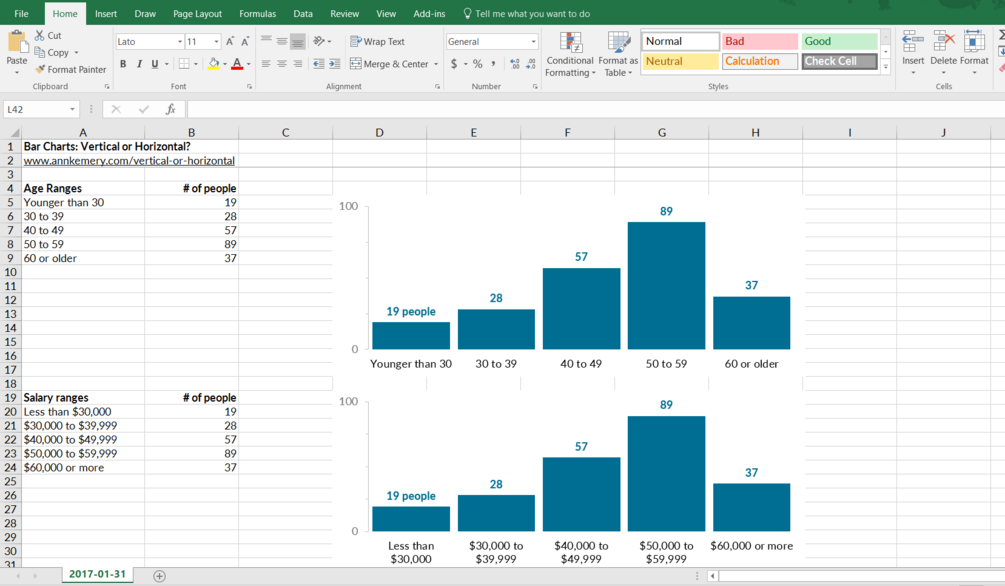 “Ann, should my bar charts be horizontal or vertical?” Ordinal variables get vertical bars and nominal variables get horizontal bars. Explore these templates yourself in the Excel file.