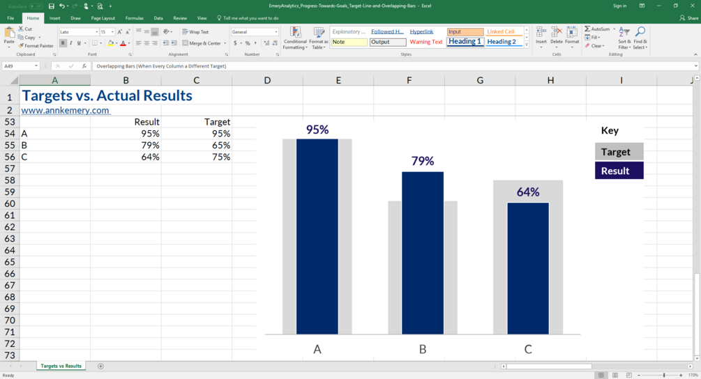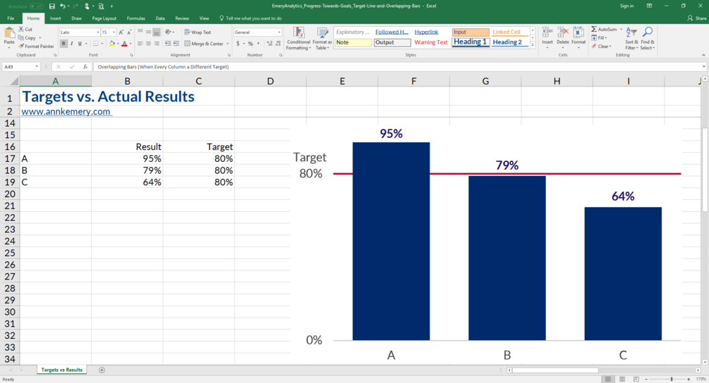 This Excel file contains two templates: target lines and overlapping bars. There are instructions for adjustment the target line. You'll have two versions of your finished graph. One's ready for a Word document (size 11 font and 6.5 inches wide) and one's ready for a slidedeck (size 18 font and 8 inches wide).