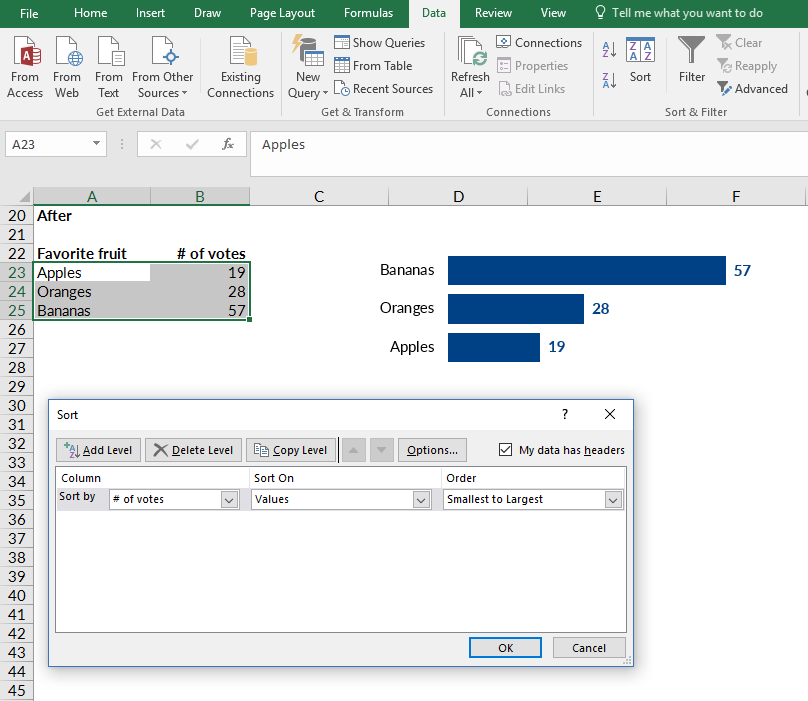 Our original table is ordered alphabetically and that just won't do. Our viewers will either want to know about the favorite fruit (a greatest to least ordering) or they'll want to know about the least favorite fruit (a least to greatest ordering).